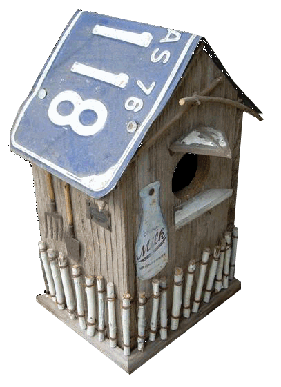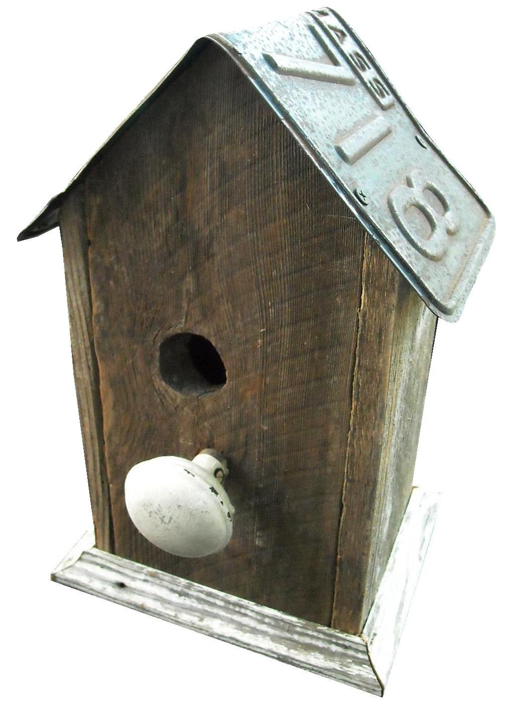 License Plate Birdhouse Much more rustic birdhouse made from old wood, a natural hole, handcrafted wood and wire picket fence, door knob, and a rustic license plate roof. $40