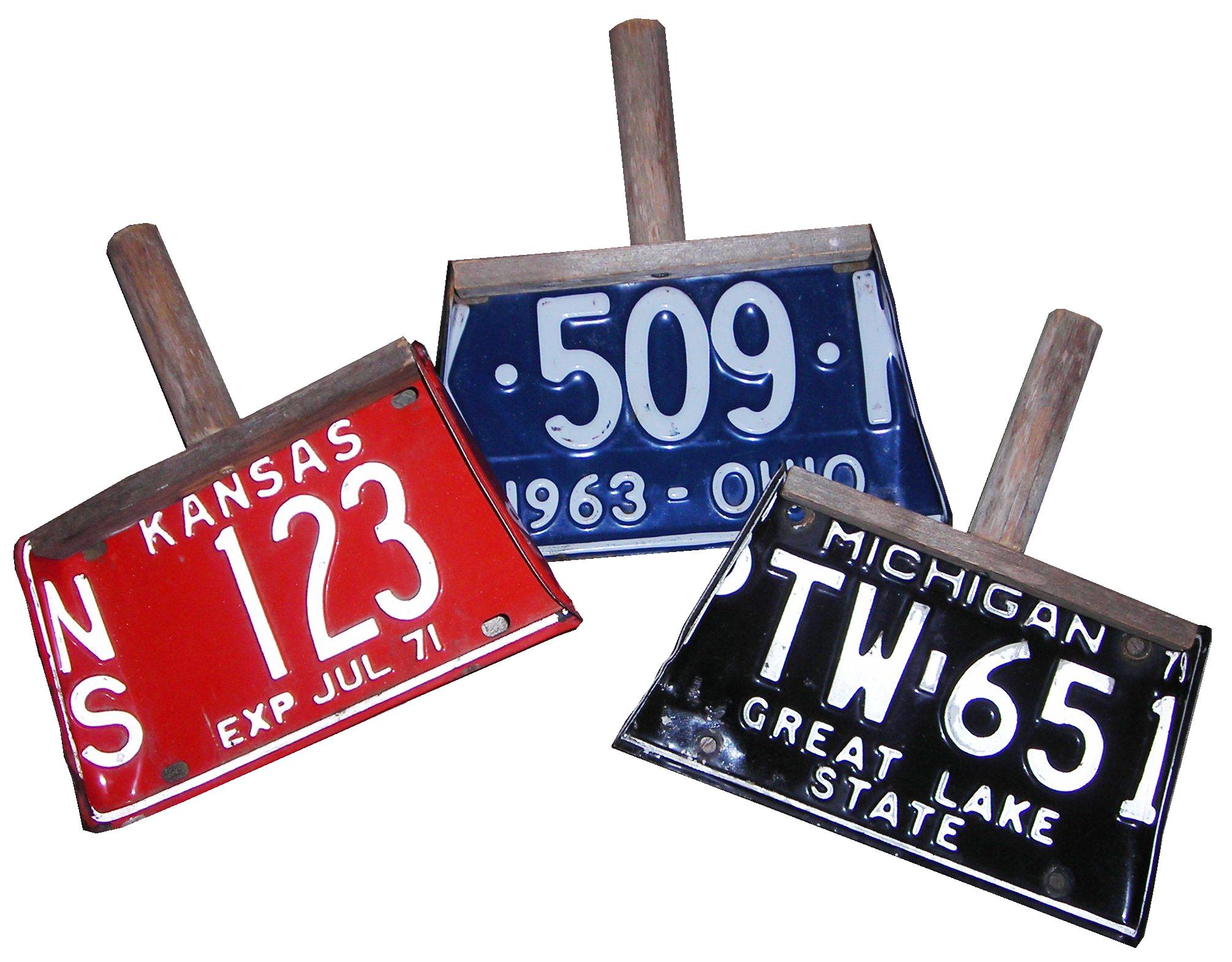 Plated Collection Completely functional dust pan made from vintage license plates and old wood. Very sturdy with nice high edges to hold lots of debris. Use mine daily in the shop! See drop-down for styles and prices. $15-20