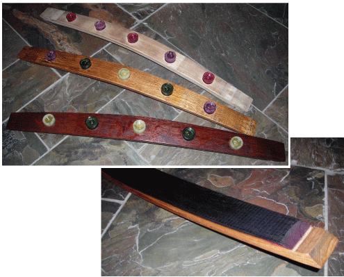 Napa Collection Made from authentic solid oak Napa wine barrels 3-7 years old, emptied recently. Comes in a variety of finishes (including natural with no stain), whatever suits your home and taste. The red wine stained bottom is visible and depending on the edge is visible on the sides as well. Approximately 36 inches long and 3 inches wide. $45
