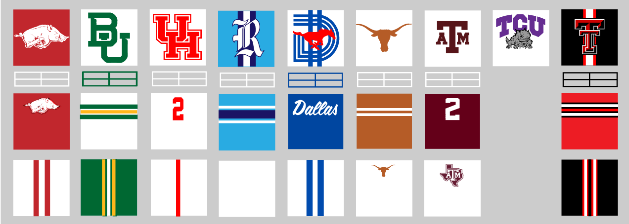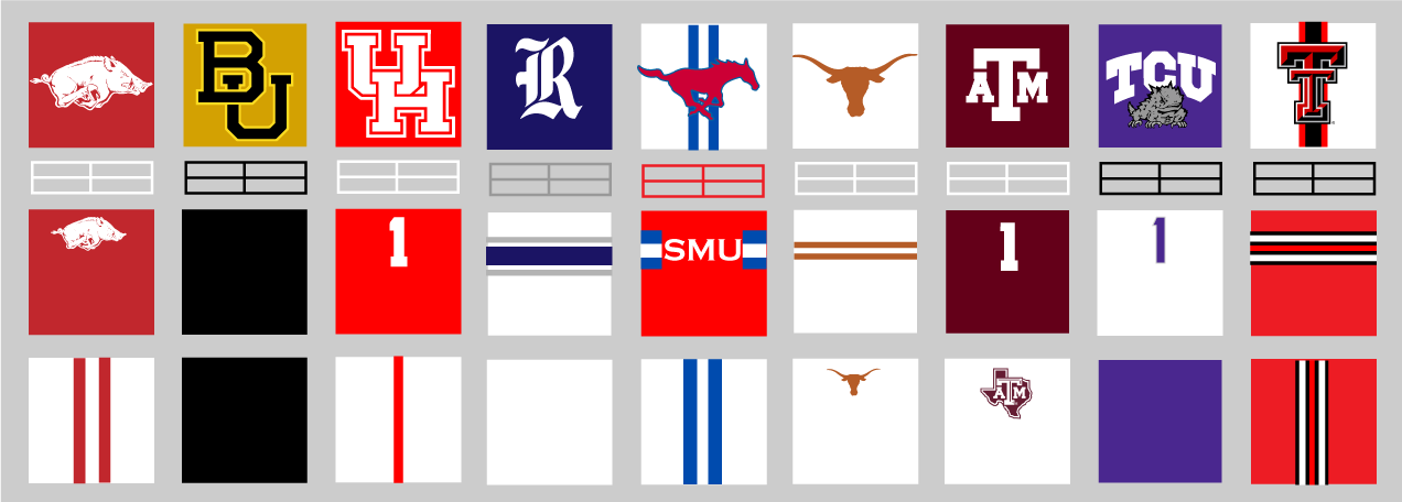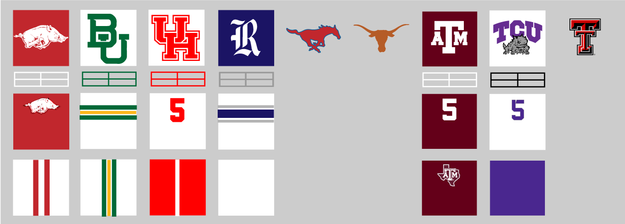 Most notably I include Arkansas, Baylor, Houston, Rice, SMU, Texas, Texas A&M, TCU, and Texas Tech.