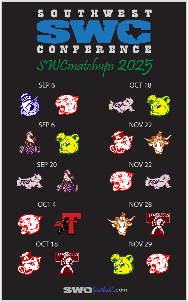 Ranked by Last Year's SWC Finish Rice - SEP 6 - Houston SMU - SEP 6 - Baylor TCU - SEP 20 - SMU Houston - OCT 4 - Tech TCU - OCT 18 - Baylor Arkansas - OCT 18 - A&M Houston - NOV 22 - TCU Arkansas - NOV 22 - Texas Texas - NOV 28 - A&M Houston - NOV 29 - Baylor BOWL GAME Virtual SWC Records 1 - Texas Tech - 0 1 - Baylor - 0 1 - TCU - 0 1 - Houston - 1 0 - Arkansas - 0 0 - Texas - 0 0 - Texas A&M - 0 0 - Rice - 1 0 - SMU - 2 Overall Records 5 - Texas Tech - 0 5 - Texas A&M - 0 4 - Houston - 1 4 - TCU - 1 4 - Baylor - 2 3 - Texas - 2 3 - SMU - 2 3 - Rice - 3 2 - Arkansas - 3 * Denotes a Bowl Game