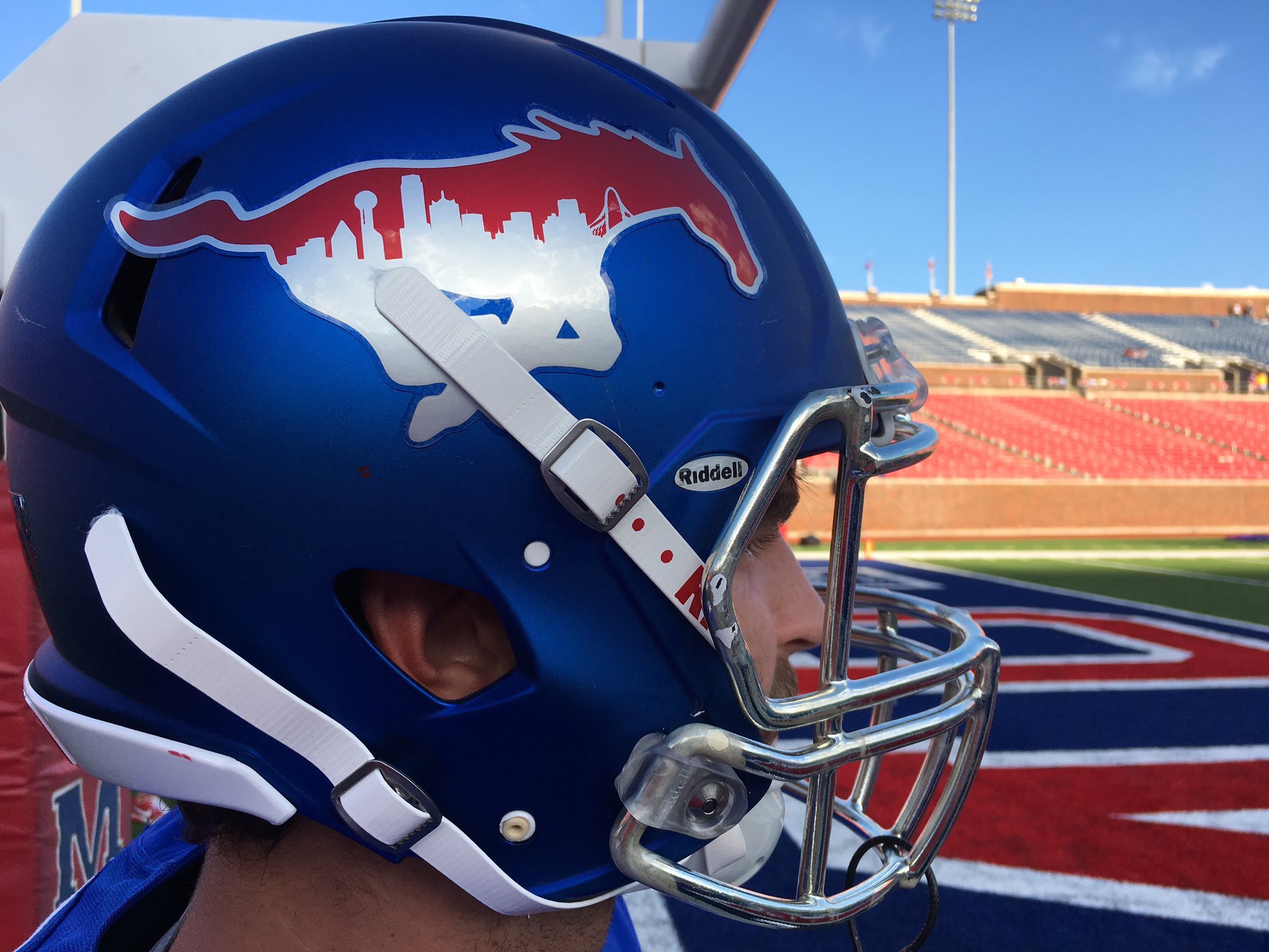 SMU's helmet logo for the Week 4 SWC matchup between SMU and TCU will have the Dallas skyline embedded inside the pony in support of first responders and fallen Dallas and SMU Police.