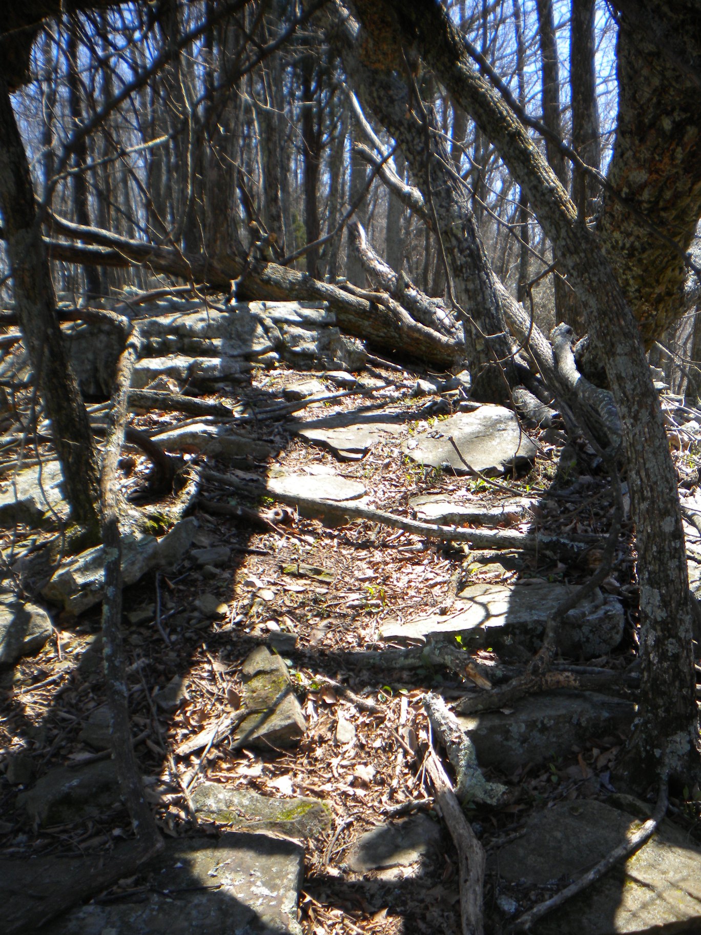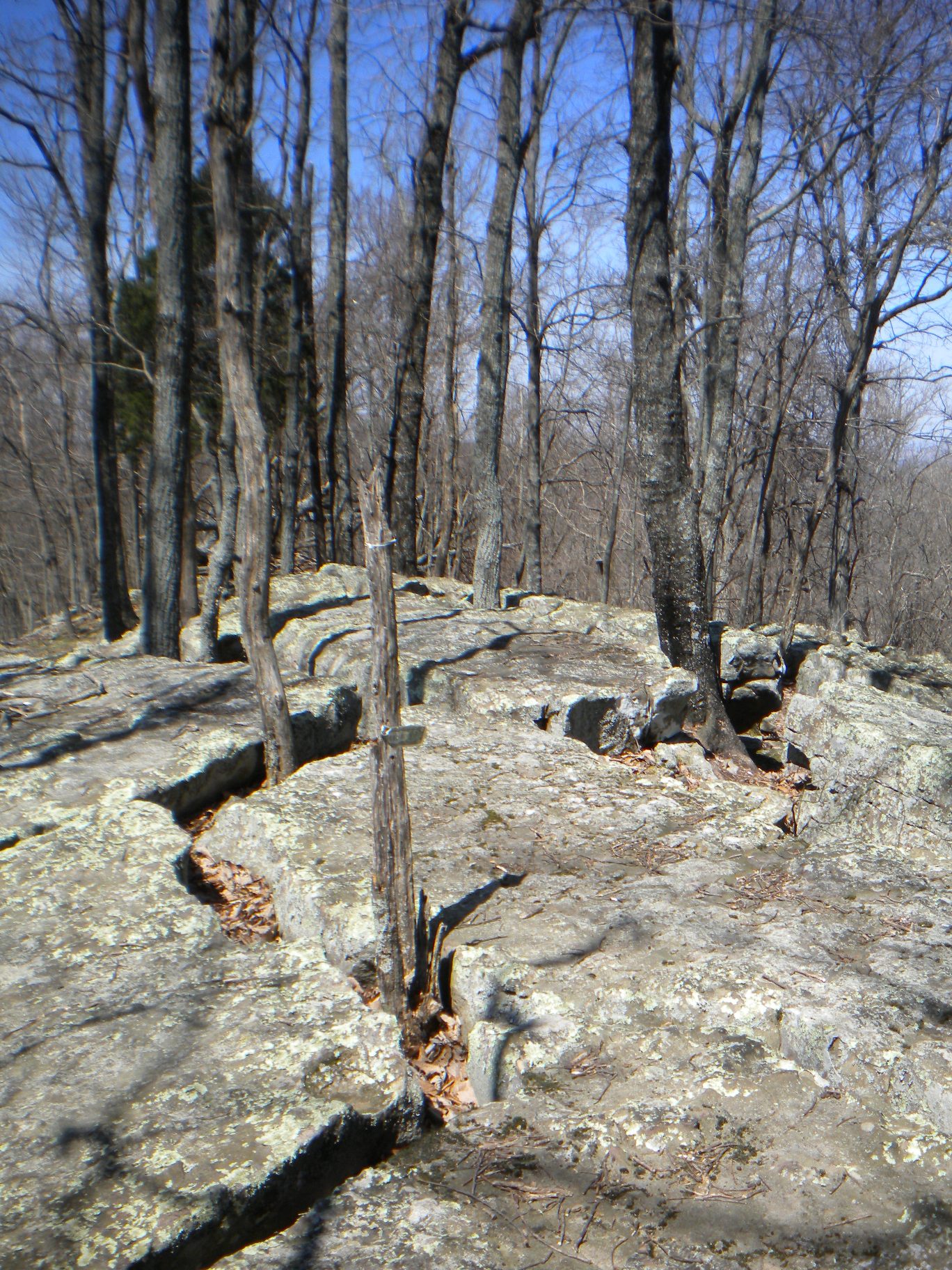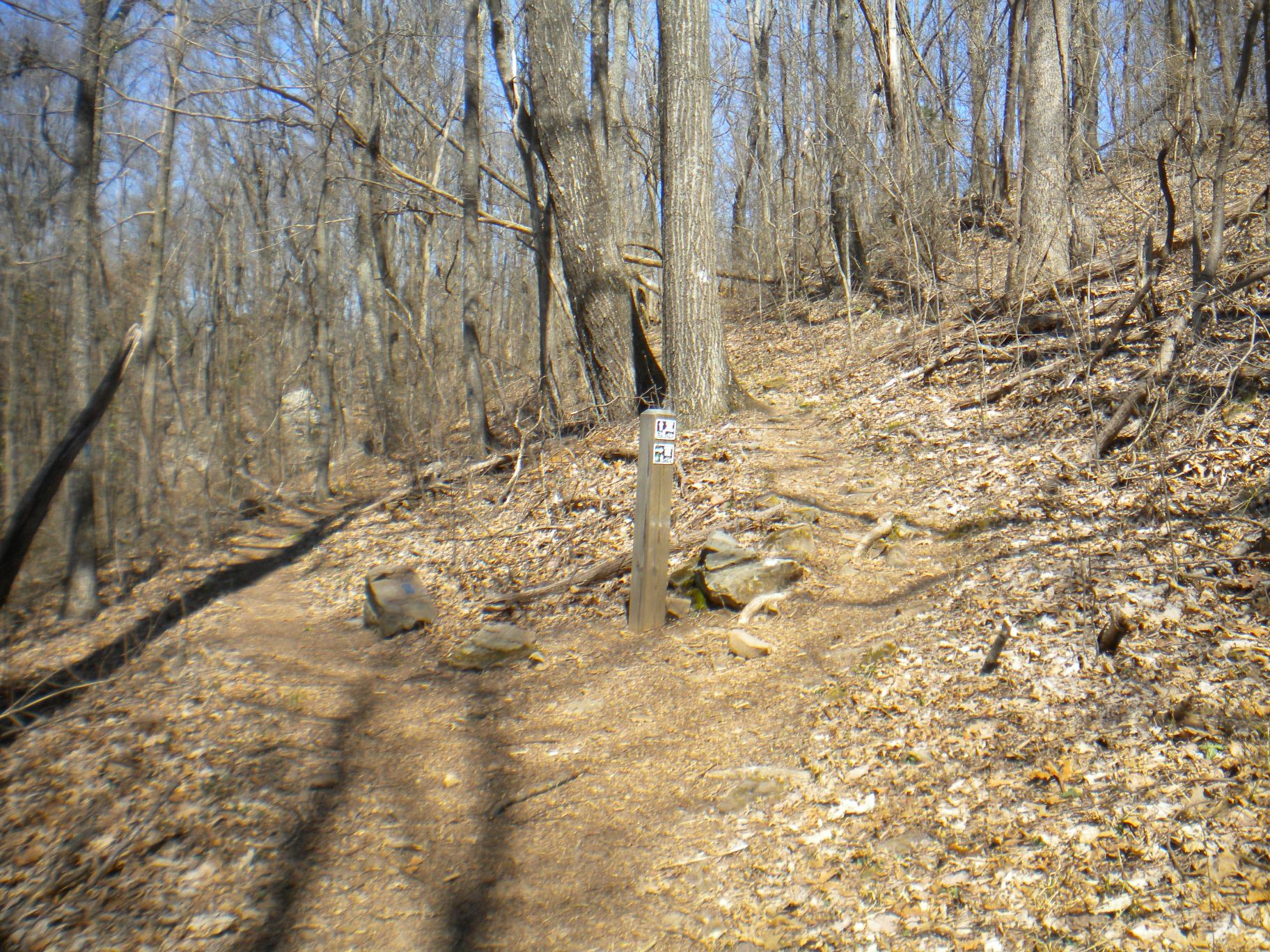 Back on my way on the Stone Cuts Trail, I see another one of those Space Shuttle markers that must have been leftover from some kind of trail run race. I only saw maybe four or five of these on all the trails I explored and never in any kind of related vicinity - maybe it was actually some kind of points station. The entry to the Stone Cuts is on the right (the blue trail is the Stone Cuts Bypass which is a flat trail on the mountain side.