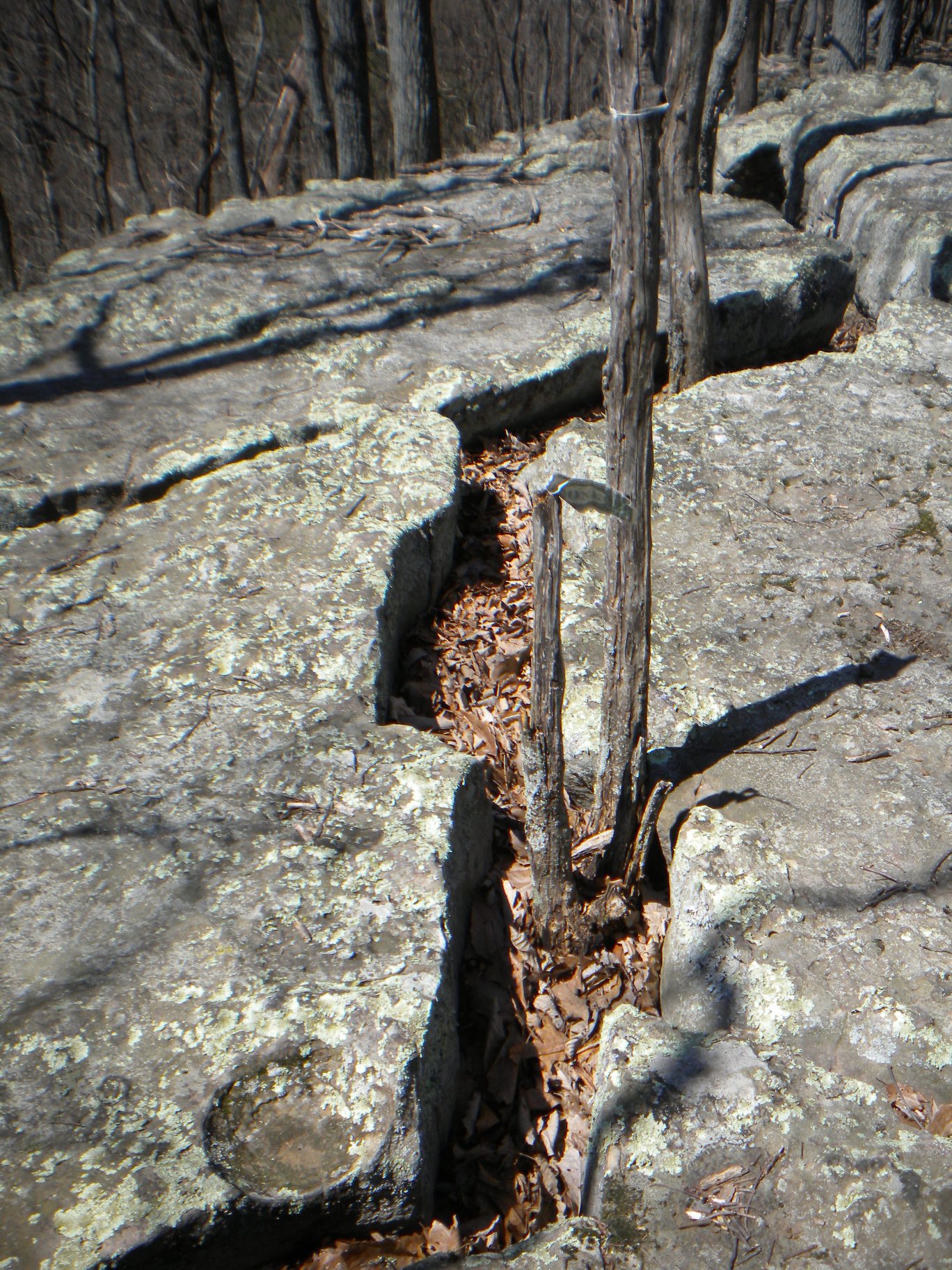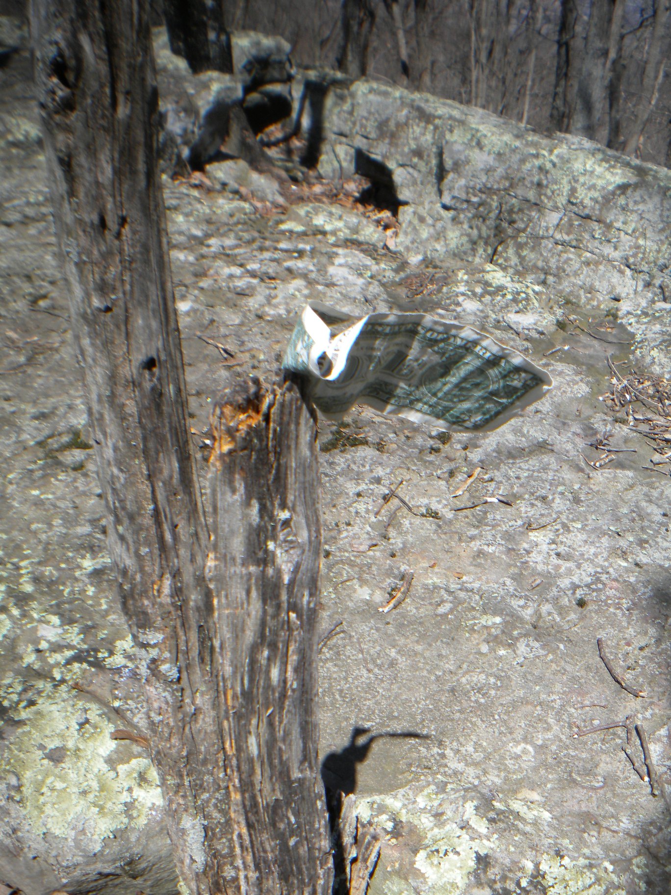 The third day provided with the opportunity to bite off a bigger chunk - meeting ended early and my flight did not leave till 6pm! So I decided to explore the Stone Cuts. With the advice of the Park Ranger (really, really good advice for this flatlander not familiar with these trails), I shortened my route. Headed down the Sinks Trail most of the elevation drop was fairly immediate, knew that would be a bit tough on the way back up. I quickly reached the Three Benches and then the intersection with the Keith Trail at the head of the Stone Cuts Trail. Once on the Stone Cuts Trail, I started going back up. En route to the Stone Cuts, I saw the Goliad Heights plateau and was disappointed my trail didn't make a turn up that hill. I noticed some beaten down leaves and took a small sidetrack up to the plateau. Perfect opportunity for some rock climbing too. Only to realize on the way down there were some natural steps on the makeshift trail... oh well, I had more fun getting up there! On top a dollar bill, someone had left a in a lovely sort of Tibetan way, was flapping in the wind like a prayer flag.