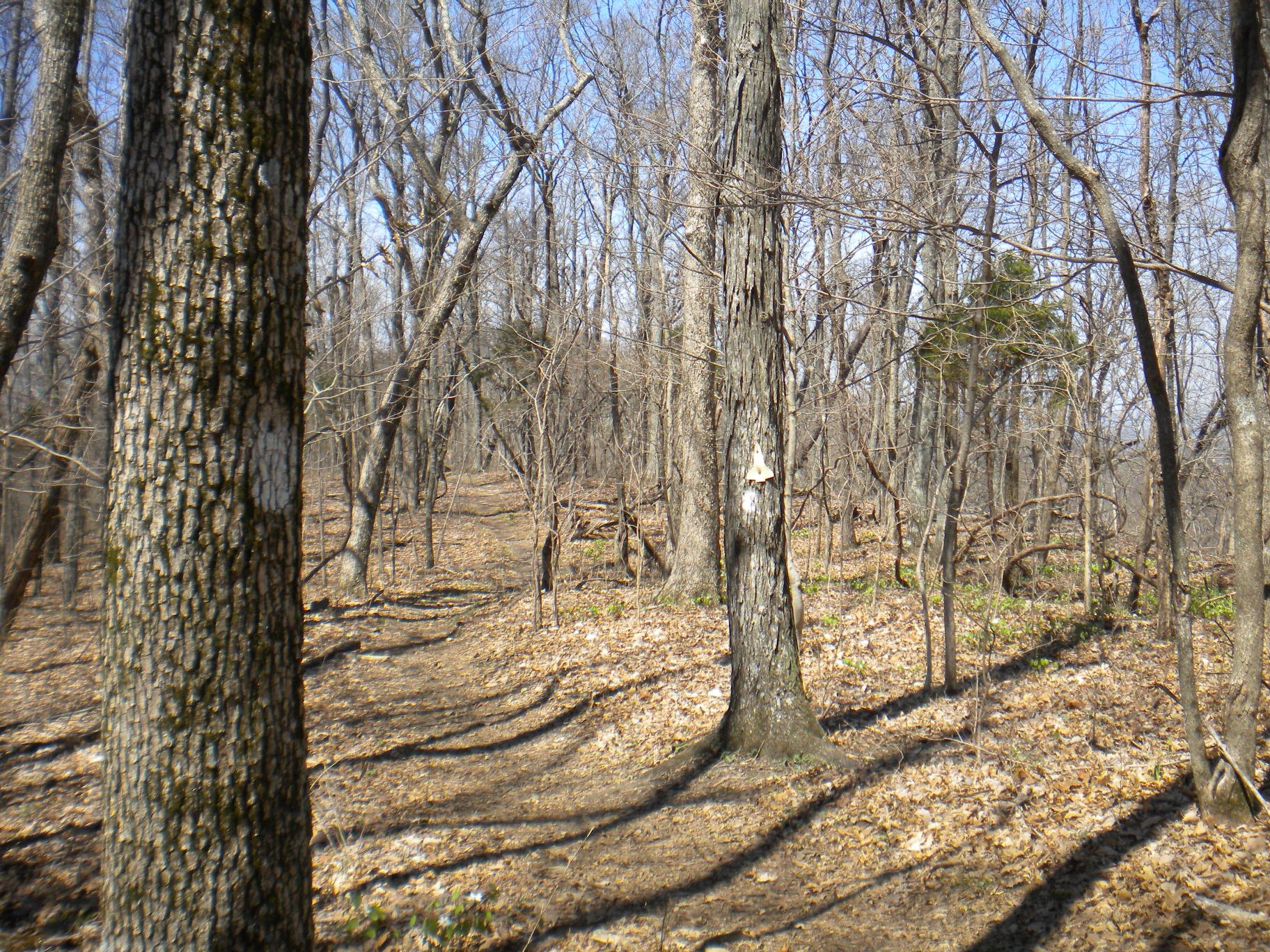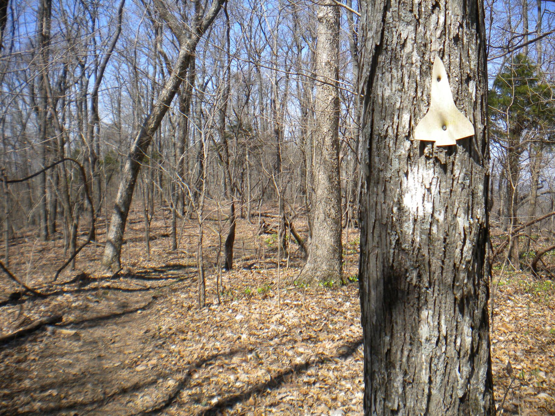 I took the Stone Cuts Bypass back towards the trailhead and ran a good bit of the way until I got back to tThe Sinks Trail where the elevation started climbing. Found three more shuttle markers I had missed on the way down. Two that were quite embedded in the new growth of the tree. So they must have been here for quite some time! A little winded occassionally on the way back up, but nothing to slow me down. In the last photo you can see the cabins built by the Corps of Engineers in the 30s. I can't wait to come back - it will take me years of trips to explore everything at this park!